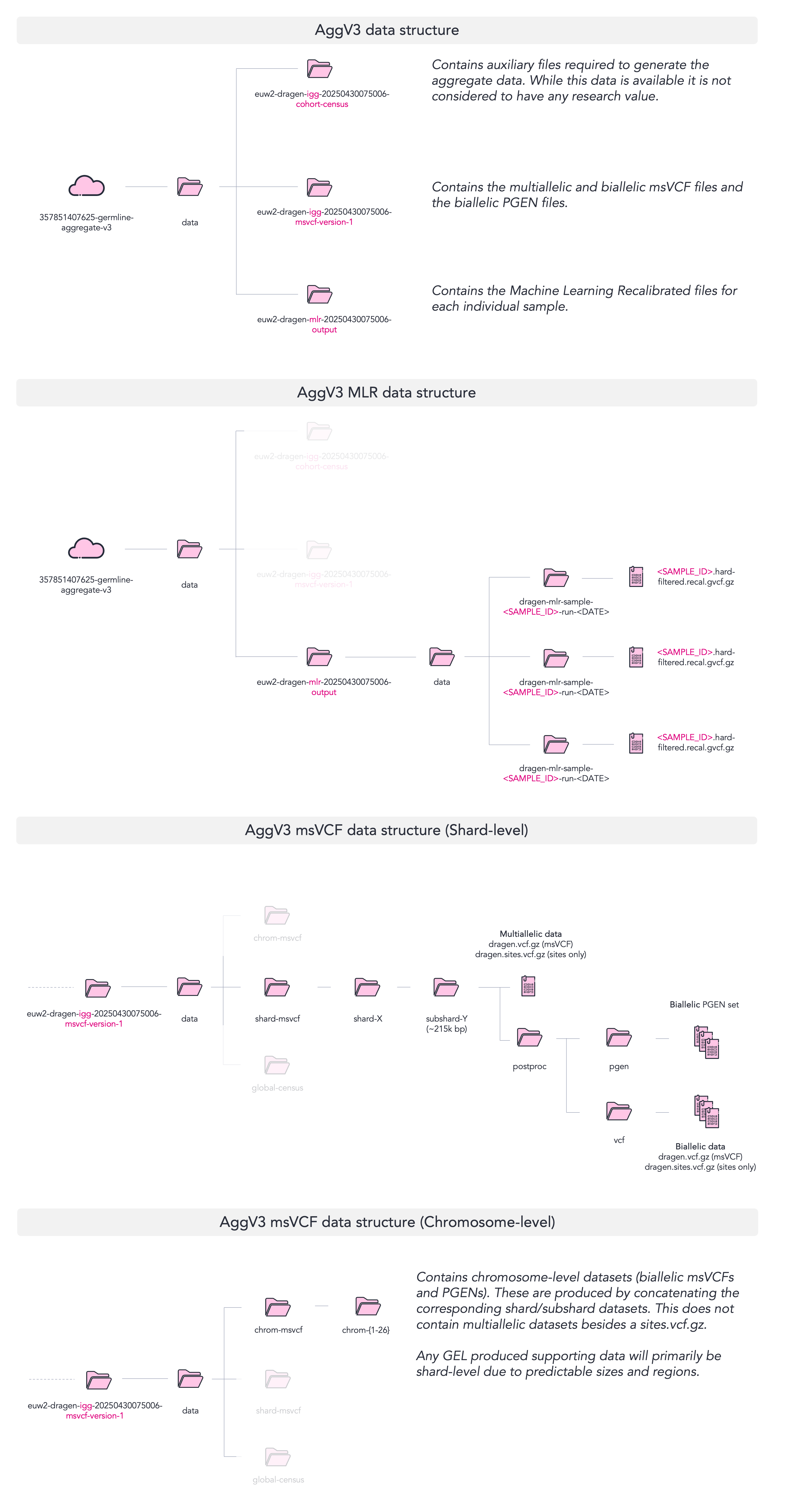 Because of the large size of an aggregate dataset, regions are split up in several msVCFs. Whereas AggV2 was previously split across >1,300 "chunks", AggV3 is split up by "shards" and "subshards".