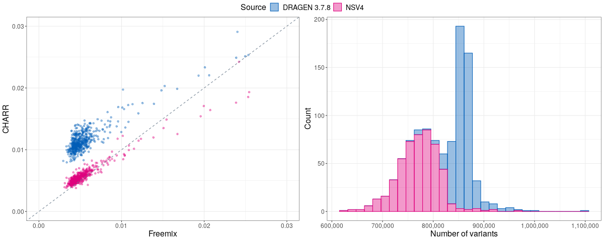 In their original publication, the authors demonstrated that CHARR strongly correlates with Freemix from VerifyBamId. To validate our implementation of CHARR, we calculated contamination estimates for 500 samples in aggV2 using two sets of variant calls: one generated by the NSV4 pipeline and another by DRAGEN 3.7.8. We then compared both sets of CHARR estimates to their Freemix values. Overall, we observed a strong correlation between the two measures, with CHARR estimates tending to be slightly higher when calculated based on DRAGEN-called variants. This inflation is likely due to the increased number of variants called by the DRAGEN pipeline.