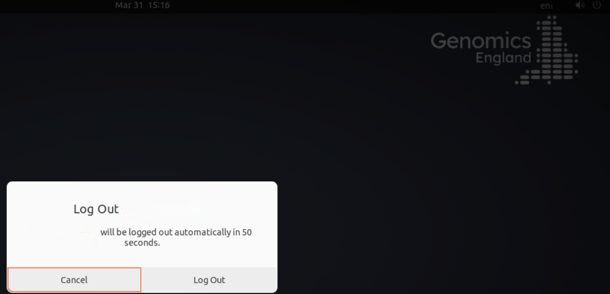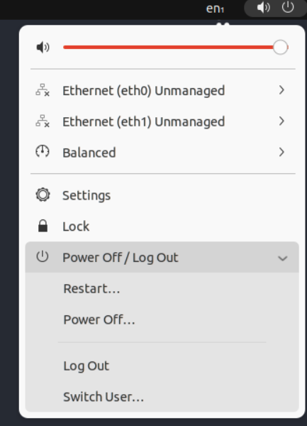 Log out by selecting the power button on the top right hand corner of the task-bar and selecting the "Log Out" option under "Power Off/Log Out".