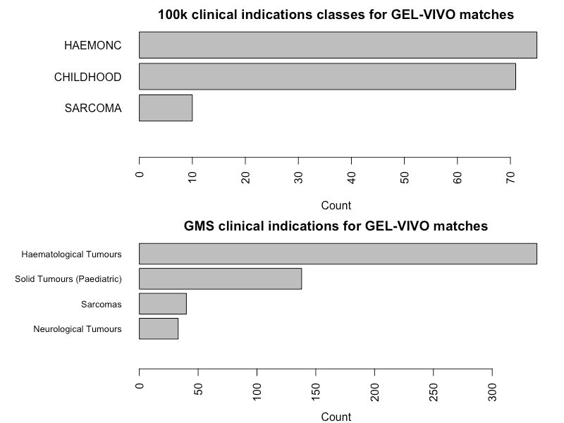 The majority of NGRL participants under 26 years old had haematological tumour diagnosis. The composition of clinical indications for participants with matching VIVO record follows the same distribution and is dominated by haematological tumours, paediatric ALL in particular, but also covers a range of solid and neurological tumours.